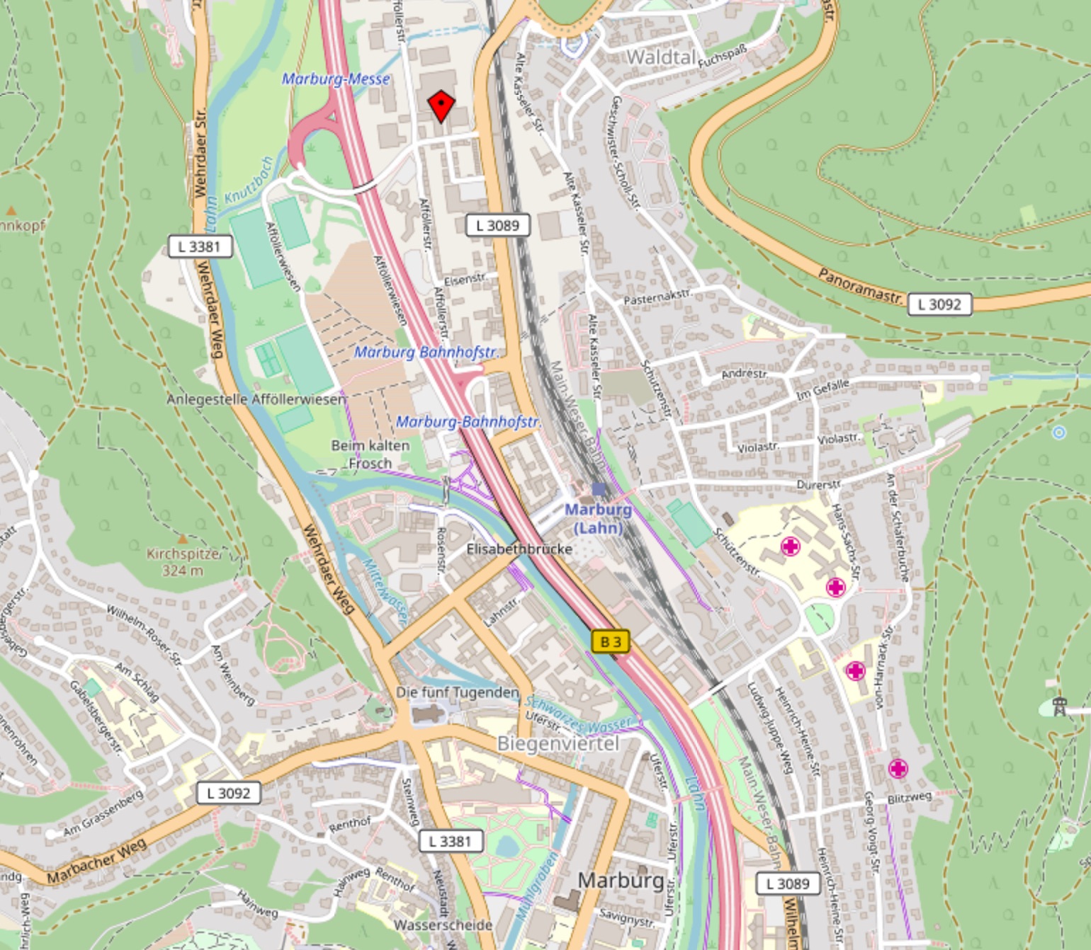 - Sie verlassen die B3 / Stadtautobahn (in Richtung Kassel fahrend) an der Ausfahrt "MARBURG-Messe"